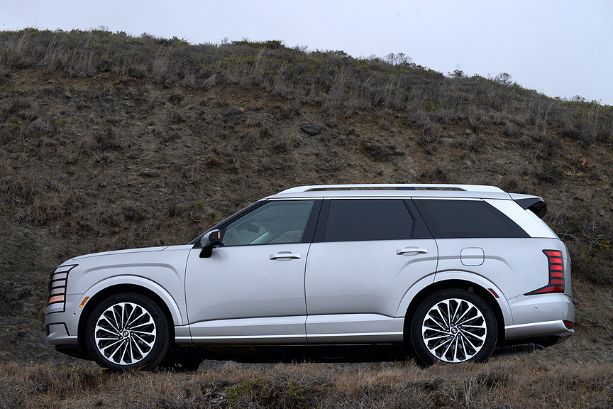 The revised 2026 Palisade has grown in length, wheelbase, and curb weight compared to the 2025 model. Length is up by 2.7 inches, wheelbase increases by the same amount, and weight is substantially boosted by 377 pounds to a new curb weight of 4,872 lbs. While lesser Palisades ride on 20 x 7.5J wheels shod with 245/50/20 rubber, the top-line Calligraphy model we tested wears upgraded 21 x 8.5J alloys mounting 265/45R21 Pirelli Scorpion MS rubber (TW 500). These Pirellis provided good ride quality, despite the short sidewall height of the tires. The sparkling upsized rims look like they were designed specifically for our Typhoon Silver rig.