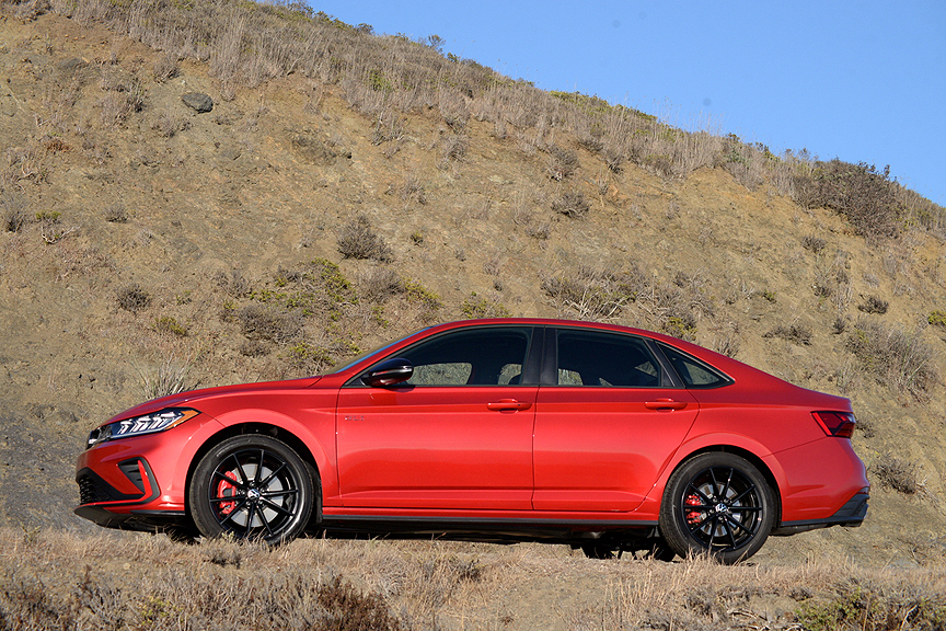 VW touts the GLI as a "the GTI with a trunk." In view of the $7,000 price savings of the GLI over the GTI, I would also call it "the GTI with its own bank account." There's really very little reason to opt for the hatchback over the sedan when you consider performance, price or appearance. Our Kings Red Metallic (optional $455) Jetta looked especially snazzy with the $650 optional GLI Black Package that darkened the alloy rims, mirror caps, and roof. For 2025, the Jetta benefits from a restyled front fascia and grill conjoined by a new full-width front light bar. The tail also benefits from new full-width tail lights and a revised trunk lid. The subtle stylistic upgrades continue inside the spacious cabin, with very supportive front bucket seats upholstered in "Grigio and Titan Black Leather." Red stitching highlights the black and gray seats. The digital instrument binnacle is business-like and dazzlingly bright. In particular, we enjoyed the vivid red line illumination of the tachometer face. The dashboard has been honed to such a fine degree of simplicity that even the newly introduced haptic HVAC controls are easy to modulate. In sum, a 2025 GLI may soon be joining our collection of vintage Porsches.